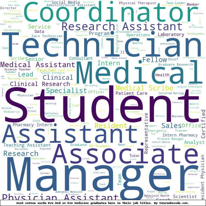 Here is a visual representation of the most common words in job titles for Pre Med or Pre Medicine graduates: