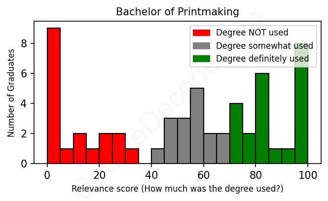 The verdict? Significantly below average. Overall, with an average relevance score of 52%, Printmaking graduates have a much lower likelihood (-15%) of finding work in this field compared to the average graduate across all fields: