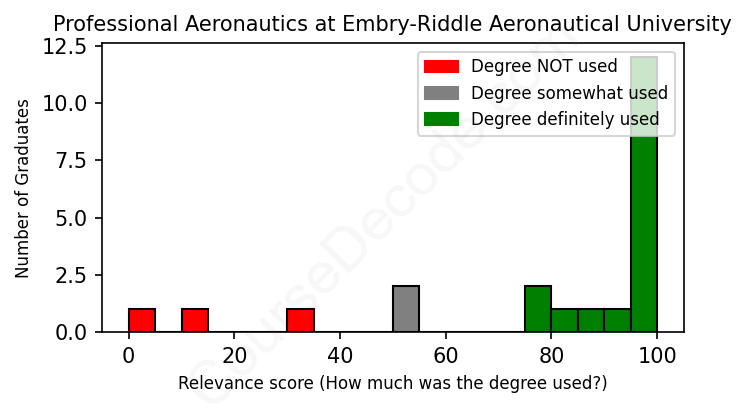 The verdict? Significantly above average. Overall, with an average relevance score of 79%, Professional Aeronautics graduates from Embry-Riddle Aeronautical University have a much higher likelihood (+12%) of finding work in this field compared to the average graduate across all fields: