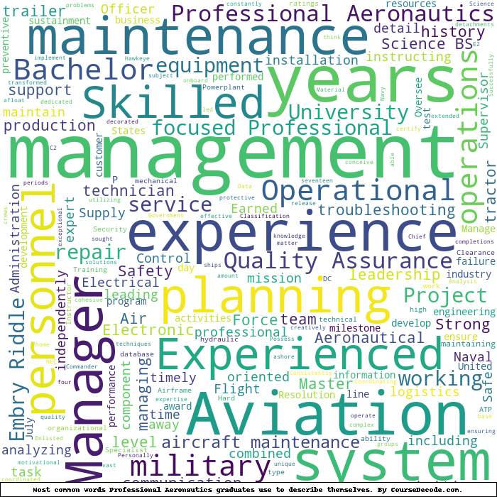 Here is a visual representation of the most common words seen in the "about" section of LinkedIn profiles who have a Bachelor degree in Professional Aeronautics (this is across all Professional Aeronautics graduates we've analyzed, not just those who went to Embry-Riddle Aeronautical University). This may or may not be useful: