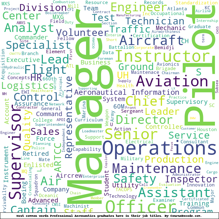 Here is a visual representation of the most common words in job titles for Professional Aeronautics graduates (this is across all Professional Aeronautics graduates we've analyzed, not just those who went to Embry-Riddle Aeronautical University):