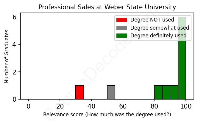 The verdict? Significantly above average. Overall, with an average relevance score of 85%, Professional Sales graduates from Weber State University have a much higher likelihood (+18%) of finding work in this field compared to the average graduate across all fields: