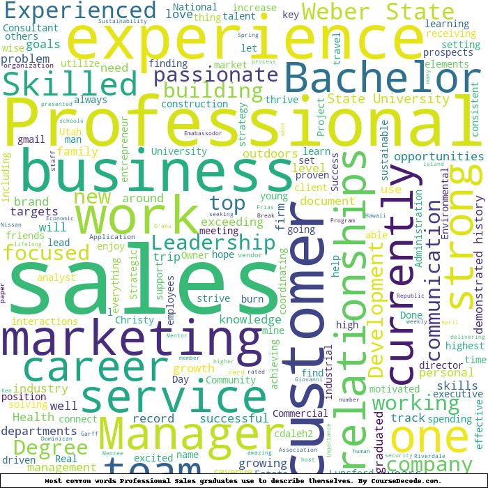 Here is a visual representation of the most common words seen in the "about" section of LinkedIn profiles who have a Bachelor degree in Professional Sales (this is across all Professional Sales graduates we've analyzed, not just those who went to Weber State University). This may or may not be useful: