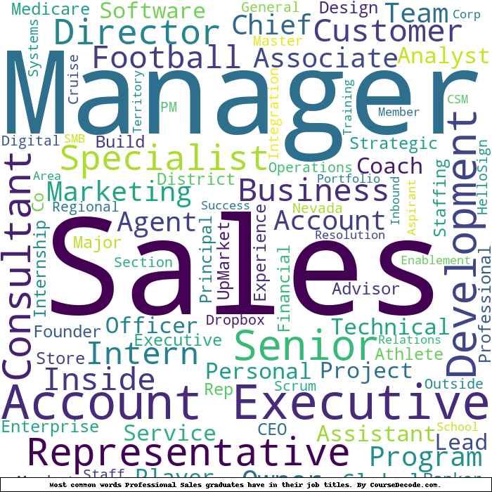 Here is a visual representation of the most common words in job titles for Professional Sales graduates (this is across all Professional Sales graduates we've analyzed, not just those who went to Weber State University):