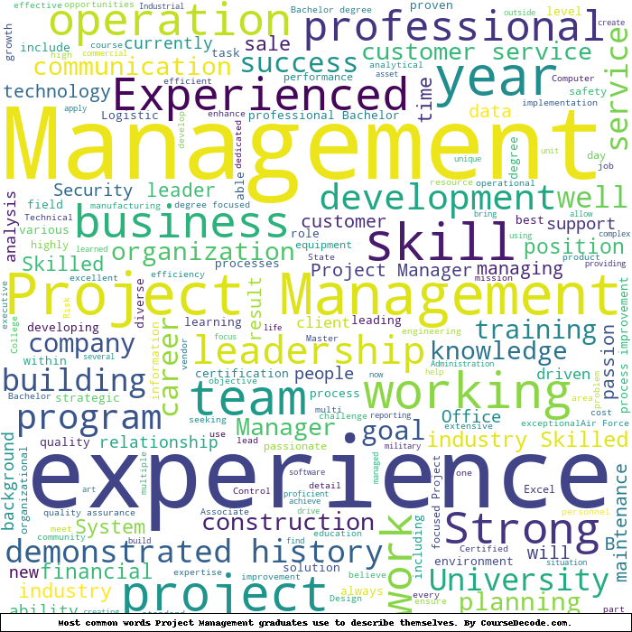 Here is a visual representation of the most common words seen in the "about" section of LinkedIn profiles who have a Bachelor degree in Project Management. This may or may not be useful: