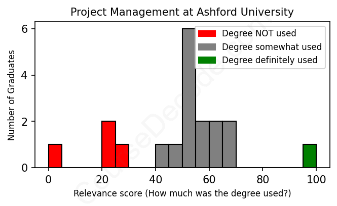 The verdict? Significantly below average. Overall, with an average relevance score of 48%, Project Management graduates from Ashford University have a much lower likelihood (-19%) of finding work in this field compared to the average graduate across all fields: