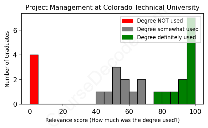 The verdict? Slightly below average. Overall, with an average relevance score of 64%, Project Management graduates from Colorado Technical University have a slightly lower likelihood (-3%) of finding work in this field compared to the average graduate across all fields:
