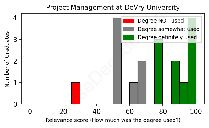 The verdict? Above average. Overall, with an average relevance score of 73%, Project Management graduates from DeVry University have a higher likelihood (+6%) of finding work in this field compared to the average graduate across all fields: