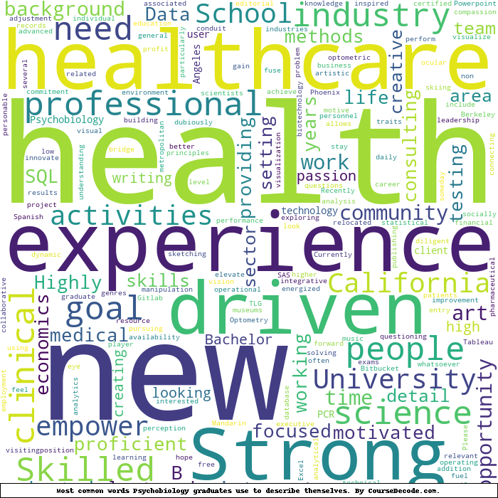 Here is a visual representation of the most common words seen in the "about" section of LinkedIn profiles who have a Bachelor degree in Psychobiology (this is across all Psychobiology graduates we've analyzed, not just those who went to University of California, Los Angeles). This may or may not be useful: