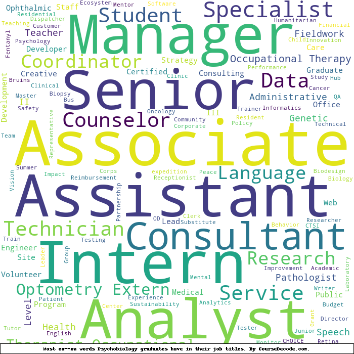 Here is a visual representation of the most common words in job titles for Psychobiology graduates (this is across all Psychobiology graduates we've analyzed, not just those who went to University of California, Los Angeles):