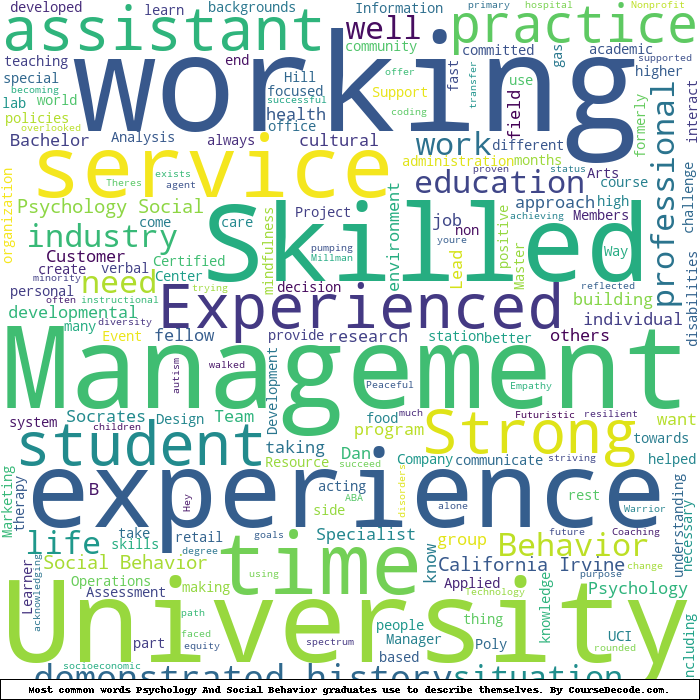 Here is a visual representation of the most common words seen in the "about" section of LinkedIn profiles who have a Bachelor degree in Psychology And Social Behavior (this is across all Psychology And Social Behavior graduates we've analyzed, not just those who went to University of California, Irvine). This may or may not be useful: