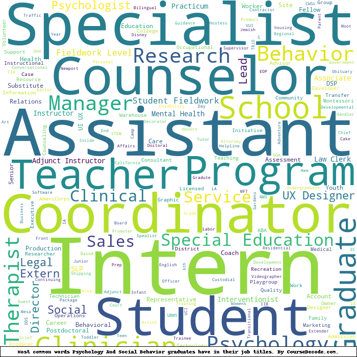Here is a visual representation of the most common words in job titles for Psychology And Social Behavior graduates (this is across all Psychology And Social Behavior graduates we've analyzed, not just those who went to University of California, Irvine):