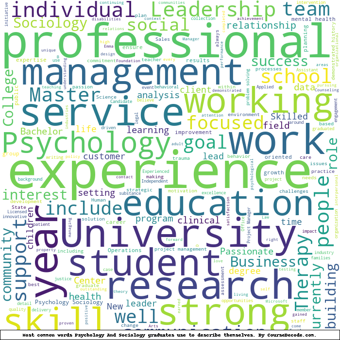 Here is a visual representation of the most common words seen in the "about" section of LinkedIn profiles who have a Bachelor degree in Psychology And Sociology. This may or may not be useful: