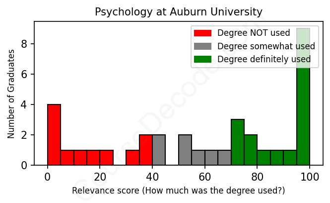 The verdict? Below average. Overall, with an average relevance score of 59%, Psychology graduates from Auburn University have a lower likelihood (-8%) of finding work in this field compared to the average graduate across all fields: