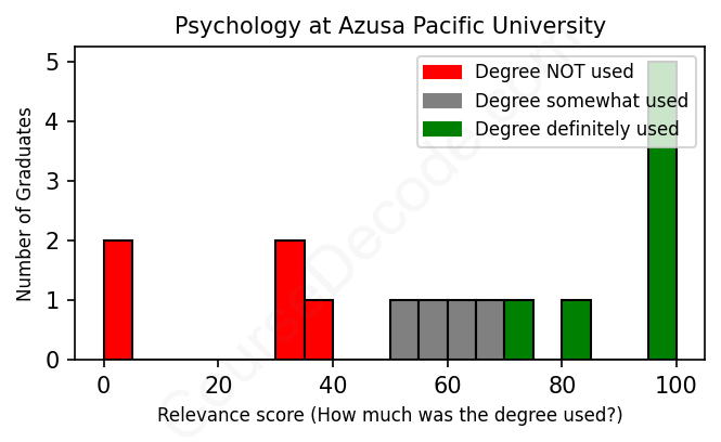 The verdict? Below average. Overall, with an average relevance score of 61%, Psychology graduates from Azusa Pacific University have a lower likelihood (-6%) of finding work in this field compared to the average graduate across all fields: