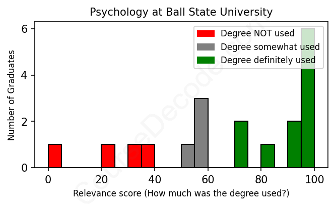 The verdict? Slightly above average. Overall, with an average relevance score of 69%, Psychology graduates from Ball State University have a slightly higher likelihood (+2%) of finding work in this field compared to the average graduate across all fields: