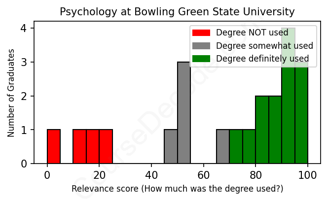 The verdict? On par with the average. Overall, with an average relevance score of 67%, Psychology graduates from Bowling Green State University have about the same likelihood of finding work in this field as the average graduate across all fields: