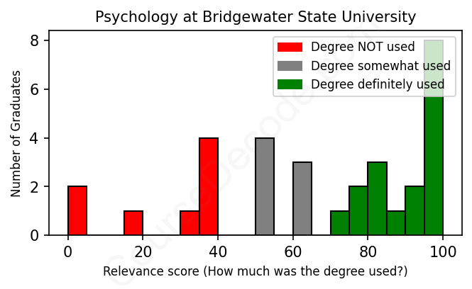 The verdict? Slightly below average. Overall, with an average relevance score of 66%, Psychology graduates from Bridgewater State University have a slightly lower likelihood (-1%) of finding work in this field compared to the average graduate across all fields: