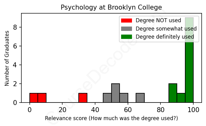 The verdict? Above average. Overall, with an average relevance score of 73%, Psychology graduates from Brooklyn College have a higher likelihood (+6%) of finding work in this field compared to the average graduate across all fields: