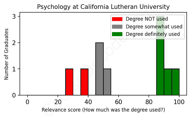 The verdict? Slightly below average. Overall, with an average relevance score of 65%, Psychology graduates from California Lutheran University have a slightly lower likelihood (-2%) of finding work in this field compared to the average graduate across all fields: