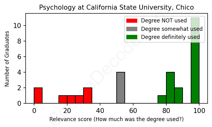 The verdict? Slightly above average. Overall, with an average relevance score of 69%, Psychology graduates from California State University, Chico have a slightly higher likelihood (+2%) of finding work in this field compared to the average graduate across all fields: