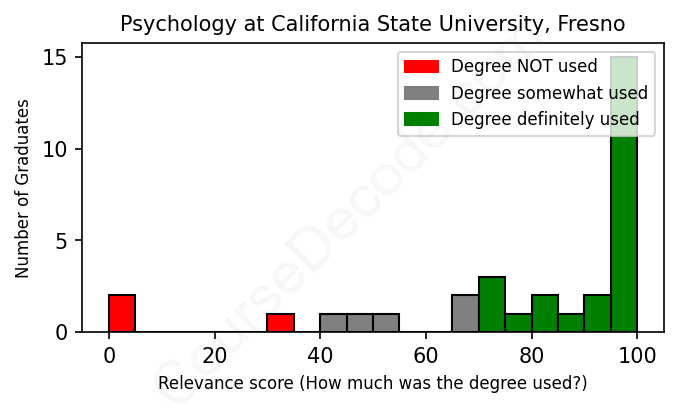The verdict? Significantly above average. Overall, with an average relevance score of 79%, Psychology graduates from California State University, Fresno have a much higher likelihood (+12%) of finding work in this field compared to the average graduate across all fields: