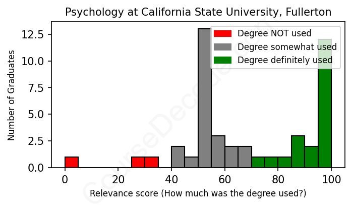 The verdict? Slightly above average. Overall, with an average relevance score of 68%, Psychology graduates from California State University, Fullerton have a slightly higher likelihood (+1%) of finding work in this field compared to the average graduate across all fields: