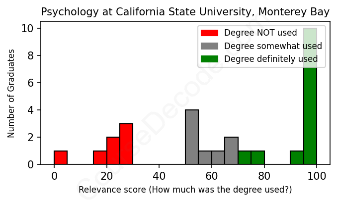 The verdict? Slightly below average. Overall, with an average relevance score of 65%, Psychology graduates from California State University, Monterey Bay have a slightly lower likelihood (-2%) of finding work in this field compared to the average graduate across all fields: