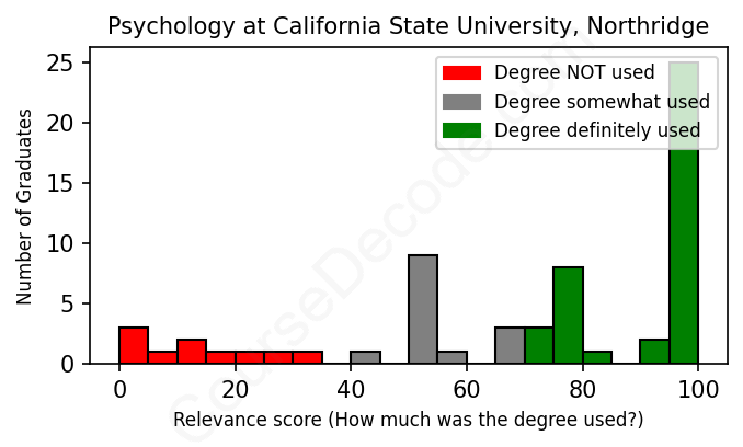 The verdict? Slightly above average. Overall, with an average relevance score of 70%, Psychology graduates from California State University, Northridge have a slightly higher likelihood (+3%) of finding work in this field compared to the average graduate across all fields: