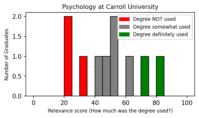 The verdict? Significantly below average. Overall, with an average relevance score of 48%, Psychology graduates from Carroll University have a much lower likelihood (-19%) of finding work in this field compared to the average graduate across all fields: