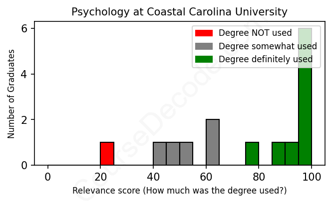 The verdict? Above average. Overall, with an average relevance score of 76%, Psychology graduates from Coastal Carolina University have a higher likelihood (+9%) of finding work in this field compared to the average graduate across all fields:
