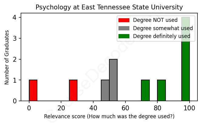 The verdict? Slightly below average. Overall, with an average relevance score of 66%, Psychology graduates from East Tennessee State University have a slightly lower likelihood (-1%) of finding work in this field compared to the average graduate across all fields: