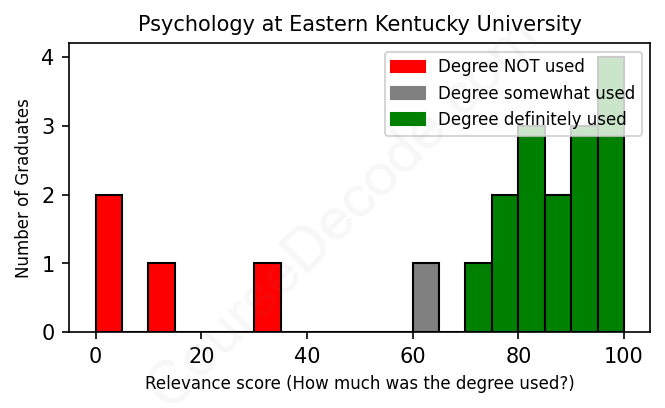 The verdict? Slightly above average. Overall, with an average relevance score of 71%, Psychology graduates from Eastern Kentucky University have a slightly higher likelihood (+4%) of finding work in this field compared to the average graduate across all fields: