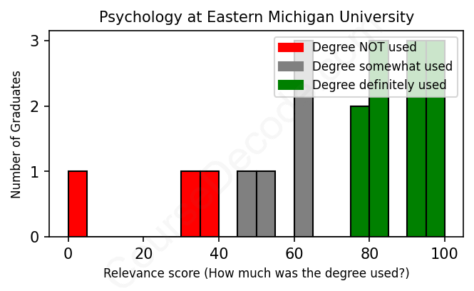 The verdict? Slightly above average. Overall, with an average relevance score of 70%, Psychology graduates from Eastern Michigan University have a slightly higher likelihood (+3%) of finding work in this field compared to the average graduate across all fields:
