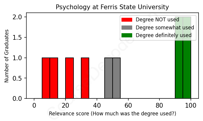 The verdict? Significantly below average. Overall, with an average relevance score of 55%, Psychology graduates from Ferris State University have a much lower likelihood (-12%) of finding work in this field compared to the average graduate across all fields: