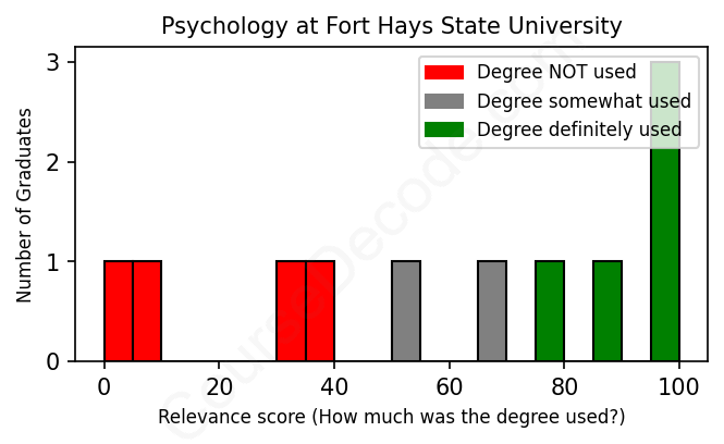 The verdict? Below average. Overall, with an average relevance score of 59%, Psychology graduates from Fort Hays State University have a lower likelihood (-8%) of finding work in this field compared to the average graduate across all fields: