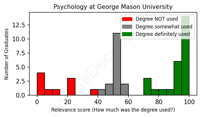 The verdict? Slightly below average. Overall, with an average relevance score of 64%, Psychology graduates from George Mason University have a slightly lower likelihood (-3%) of finding work in this field compared to the average graduate across all fields: