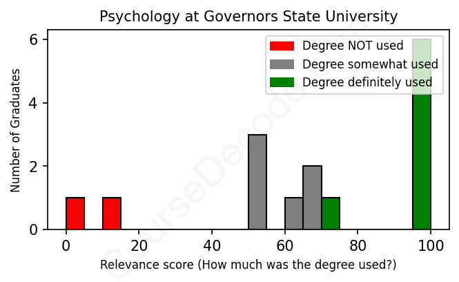 The verdict? Slightly above average. Overall, with an average relevance score of 68%, Psychology graduates from Governors State University have a slightly higher likelihood (+1%) of finding work in this field compared to the average graduate across all fields:
