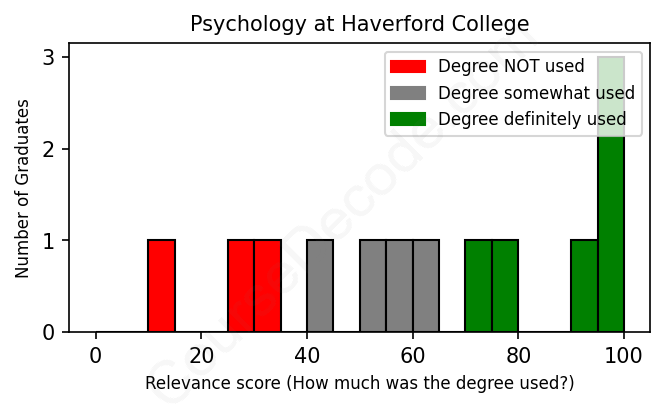 The verdict? Slightly below average. Overall, with an average relevance score of 63%, Psychology graduates from Haverford College have a slightly lower likelihood (-4%) of finding work in this field compared to the average graduate across all fields: