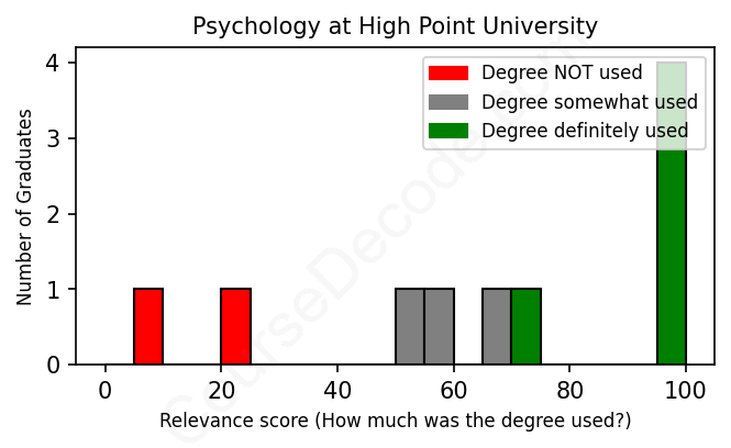 The verdict? Slightly below average. Overall, with an average relevance score of 66%, Psychology graduates from High Point University have a slightly lower likelihood (-1%) of finding work in this field compared to the average graduate across all fields: