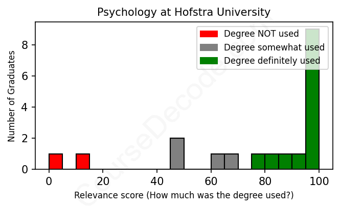 The verdict? Above average. Overall, with an average relevance score of 77%, Psychology graduates from Hofstra University have a higher likelihood (+10%) of finding work in this field compared to the average graduate across all fields: