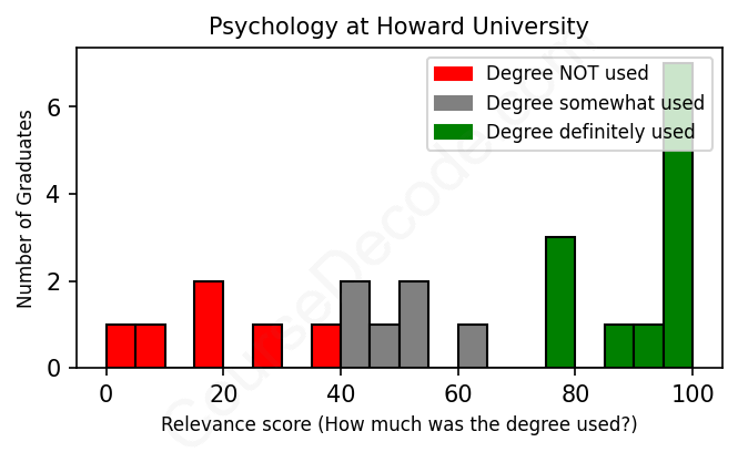 The verdict? Slightly below average. Overall, with an average relevance score of 62%, Psychology graduates from Howard University have a slightly lower likelihood (-5%) of finding work in this field compared to the average graduate across all fields: