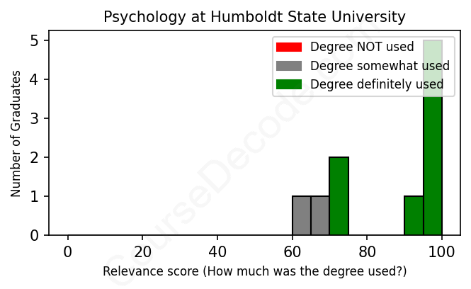 The verdict? Significantly above average. Overall, with an average relevance score of 85%, Psychology graduates from Humboldt State University have a much higher likelihood (+18%) of finding work in this field compared to the average graduate across all fields: