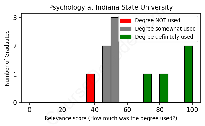 The verdict? Slightly below average. Overall, with an average relevance score of 63%, Psychology graduates from Indiana State University have a slightly lower likelihood (-4%) of finding work in this field compared to the average graduate across all fields: