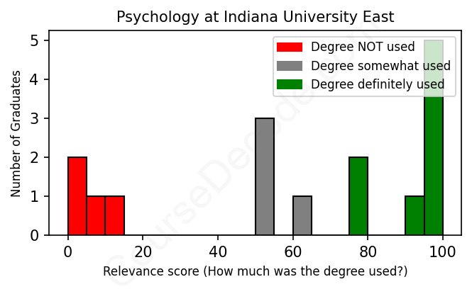 The verdict? Below average. Overall, with an average relevance score of 61%, Psychology graduates from Indiana University East have a lower likelihood (-6%) of finding work in this field compared to the average graduate across all fields: