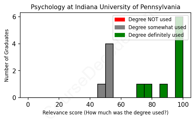 The verdict? Above average. Overall, with an average relevance score of 77%, Psychology graduates from Indiana University of Pennsylvania have a higher likelihood (+10%) of finding work in this field compared to the average graduate across all fields: