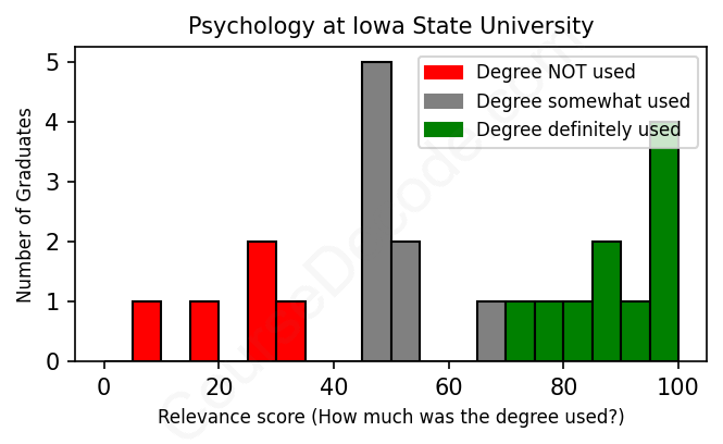 The verdict? Below average. Overall, with an average relevance score of 61%, Psychology graduates from Iowa State University have a lower likelihood (-6%) of finding work in this field compared to the average graduate across all fields: