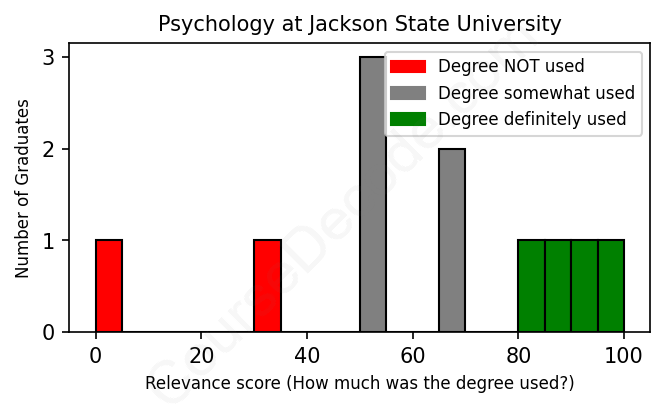 The verdict? Slightly below average. Overall, with an average relevance score of 62%, Psychology graduates from Jackson State University have a slightly lower likelihood (-5%) of finding work in this field compared to the average graduate across all fields: