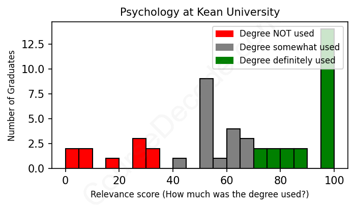The verdict? Slightly below average. Overall, with an average relevance score of 64%, Psychology graduates from Kean University have a slightly lower likelihood (-3%) of finding work in this field compared to the average graduate across all fields: