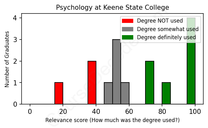 The verdict? Slightly below average. Overall, with an average relevance score of 64%, Psychology graduates from Keene State College have a slightly lower likelihood (-3%) of finding work in this field compared to the average graduate across all fields: